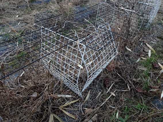 雪の重さで曲がったり折れたりしたワイヤーネット