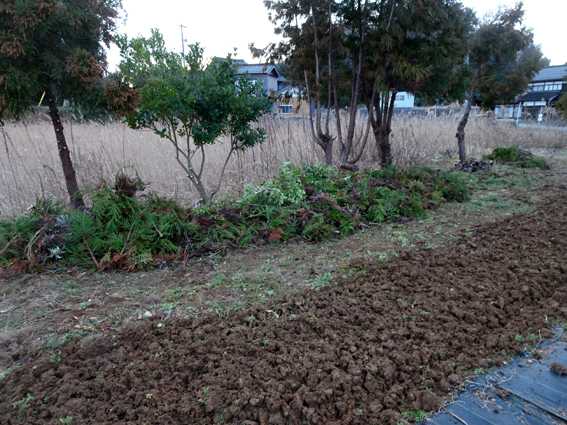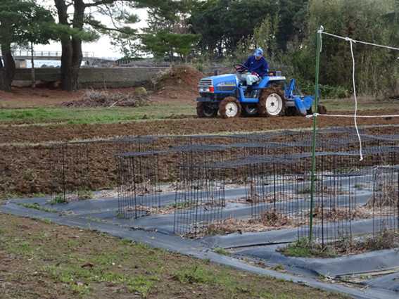 トラクターで畑の草を伸びないように土から起こしておく