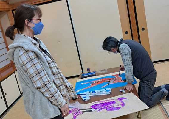 私も久しぶりに色を使って描いてみたが、調子がつかめない。けれどアクリル絵の具は上書きが楽だから、気楽にぺたぺた塗っている。