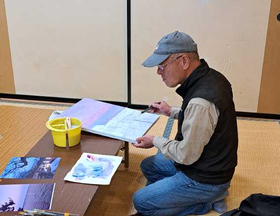 久しぶりにメンバー6人が揃った絵画教室の夜は雨。日中は暑いほどの日差しの中、農作業をしていたから少しお疲れの人もいる。それでも集まってくるところが、すごいな~(^^