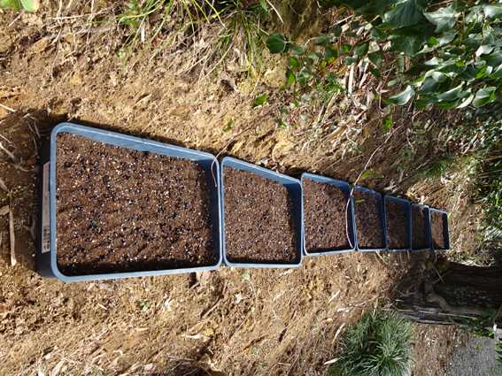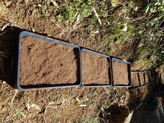 10個の穴あきトレイを準備し種まき用の土を入れ適度に散りばめて