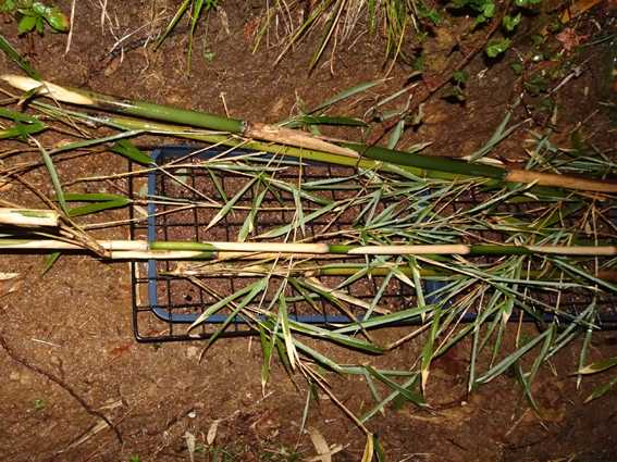 座りにくいようにササや杉葉をおいて竹を置き風に飛ばないようにした