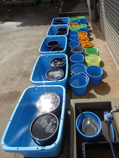 雪が融けてバケツ30数個のトイレ用水を並べている