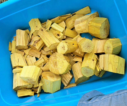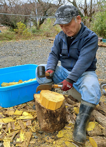 ウルシ廃材の外皮とシロタを鉈で割り削ぎ落す