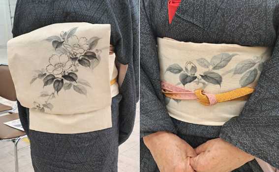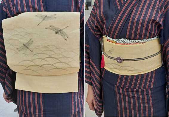 ご自身で織り上げた上布の縞にトンボの手描き帯
