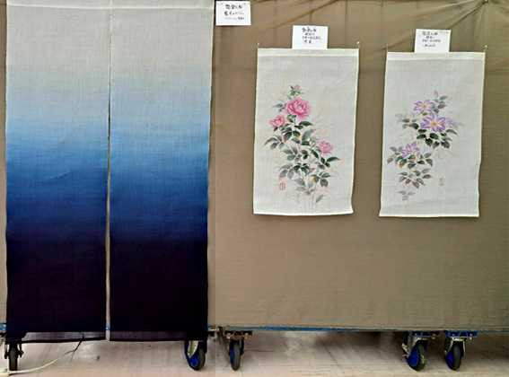 左はインド藍の濃淡グラデーション上布暖簾、右は壁掛け花模様