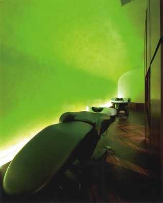 半個室のシャンプールームでは、深海にいるような雰囲気で