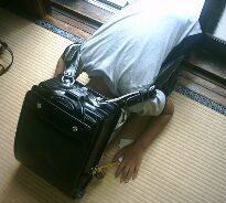 寝室に置いたPCの前で、「今日はイマイチな日記しか書けへんかったなぁ…」と思っていたところへ、息子が学校から帰ってきた。 うちのアンポンタン(~_~;)は、玄関から家に入らず、庭に面したガラスサッシから居間へと上がってくる。 大人には何でもない庭と居間との高低差も、息子にとってはまだ大変なようで、上がるときには「よっこらしょ」、とよじ上がるような感じになる。 「おかえり~(^^)」と、居間に入った私が見たものは・・・。↓ 息子 「かあ(さん)~~、助けて、起き上がれない~~(T_T)!」 私 「…何やってんの、アンタ・・・(~_~;)?」 ランドセルが重くて、頭が上げられなくなったらしい…。 取りあえず助け起こした後。 私 「面白かったから、写真撮らせて☆」 息子 「かあ~~(~_~;)!」 文句を言いながらも、もう一度やってくれる息子よ、キミはケナゲだ(^_-)-☆。