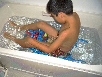 お風呂場に水をためる息子。 息子が牛乳パックメインで手作りしたイカダを、いよいよ浮かべてみることにしたのだが。。 果たして、ちゃんと浮かぶのか? 「早く水たまれ~~!」 そう言いながら、2つ折れになって浴槽を覗き込んでいる息子。 …って、アブナイからやめいっ!! ようやく水がそこそこたまり、そ~っと浮かべてみると。。 おお、浮かぶには浮かんだじゃんか☆ わくわくしながらイカダに乗ろうとする息子に、私は言った。 「洋服ぬれたらアカンから、服は脱ぎよし」 「え、脱ぐの~、メンドクサイーー」 出たな、息子の"めんどくさい"。(-_-;) でもアカン。脱いどいて。(ビシッ!) 有無を言わさず息子をパンツ1丁にさせ、ようやく浮かんでいるイカダに"乗船許可"(?)を出した私。 「デジカメ用意できたから、乗っていいよ~」 で、息子がそっと静かに、慎重に乗ってみると。。 牛乳パックの口の止め方が甘かったようで、どんどん浸水。 息子の重みに耐えられず、沈んでいくぅぅぅぅ~~~~!!(つд`) あわててイカダから降りた息子。 「かあ、パンツびちょびちょお~~~~(T_T)」 挑戦は、あっけなく終わった…。 私が水浸しになった息子のイカダを外に干していると、ひどく落ち込んだ息子の、 「もうやんないっ! イカダなんか浮かないもんっ!!」という声が聞こえてきた。 この日1日、息子はイカダの"イ"の字も、口にしなかった。。。 ここに、息子の『打倒! チーム平塚』…の夢は、あっけなくついえた。 と思いきや、その翌日! 「もしもし、ばあ(ちゃん…私の実母)? 空いた牛乳パックあったら、送って☆」 私が帰省の荷物を送る相談を電話で母にしていたところ、その受話器を取って話に割り込んだ息子。 おいおい、空いた牛乳パック、関西からこっちへ送れってか…????(ー∇ー;) そう、息子はまだ"夢"を捨てていなかったのである。 「ビニールテープなくなったから、買って来るね♪」 おこづかいの入った財布をポケットに突っ込んで自転車をかっとばし、ビニールテープをコンビニまで探しにいったが見当たらず、郊外のホームセンターまで行き。 広い店の中を歩き回って、ようやく探し当てた…と自慢げに話す息子。 少しずつ、少しずつ、"メゲない力"がついてきた息子である。。↑その名も、『いかだ焼き【お盆0807】』! 『手羽先を開いた形がいかだに似てるから』、手羽先の焼き鳥をこう呼ぶんだそうです…なるほど。↑イカダ型の箸置き…だそうですが、船頭さんがつまようじを持ってくれるところがミソ^^ 息子が今回イカダを作るキッカケになった『TVチャンピオン2』でも、こういう、昔ながらの木でできたイカダが頑張っていたっけなぁ。。人気blogランキングへ ↑宜しければ、クリックよろしくです^^