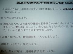 昨日のブログにコメントを下さった皆さん、また目を通していただいた皆さん、応援に心より感謝しています。m(__)m 以前と違い、お一人ずつに、コメントへのレスをお返ししていないので申し訳ないのですが。 もちろん、いただいたコメントはすべて、(エ○や荒らし以外^^;)ありがたく読ませていただいています☆ で、コメントをお返ししないことでできた時間には、現在、入院のための荷物を用意したり、病院からもらってきた、『これから肺がんの手術を受ける方に』とか『手術麻酔についての解説書』なるパンフを読み返したり、ボーッと寝転がったり。 やっと、そんな余裕ができてきた。 それまでは正直、「ワイドショー見てても、急に涙出てくる」とか、もう全く余裕がなくて。 自分で自分が『"うつ"だろこれ?』と思って、心療内科にもかかりに行ったりしたもんね。(^_^;) 結果、"抗うつ剤&睡眠薬デビュー"と相成ったものの、でもそれで結構調子いいので、もうちょっと心療内科とお付き合いするつもりだ。 かなり話がそれてしまったが、気持ちに余裕ができた原因が、もうひとつ。 ようやく私、23日に行われる、息子の小学校卒業式に出席できることが確定したのだ! (→ま、がんを95%疑われていても、卒業式をキャンセルしてでも、即入院できない…というほど、がん専門病院が混んでいる…ということなのだが^^;) 当日息子が着ていく、まだ新品の学生服のタグなどをはずしたり、Yシャツなど名前が書き込めるものには書き込んだりして、準備しとります。 学校からも連休前にこんな、お達しのプリントがやってきたし。↓ …って。 なんか、もう中学生になろうかという子供たち向けのお達しにしては、ミョーに細かい気もするが。(笑) でもうちの息子を見てる限り、これぐらい書いておいていただかないことには、 「ほら~、プリントにちゃんと書いてあるやろが! 小学校卒業する人がこんな、 『髪の毛パイナップル』(…の葉っぱ状態の寝ぐせ。。)はあかんの! ドライヤーかけなさい!!」 と、私が怒る言葉に、説得力がないんですなぁ。。 いっつも息子の、 「だ~いぶ(大丈夫)、だ~いぶ! 何とかなるって☆」 という言葉でごまかされてしまうダメ母なもんで。(-_-;) ↑『 ギャツビー 寝ぐせ直しウォーター 285ml』。 この先の息子の、必需品となってしまうのか??(T_T)応援いただけると、本当にありがたいです。m(__)m↓