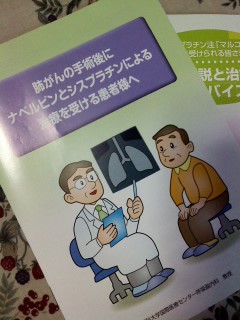 6/22、また、がん専門病院に入院した私。 その目的は、『左の肺がん切除術後の、補助化学療法・1クール目』… つまり、 左の肺の上葉(上部)に肺がんあったから、左上葉とその辺のリンパ節、み~んな取ったけど。 取ったリンパ節の中に、顕微鏡で見なわからんぐらいのがんが飛んでたし。(T_T) 他にも知らんうちに転移があるかもしれんから、化学療法…抗がん剤で、まずは1回、叩いておくよ。 …ということである。 ちなみに、私の抗がん剤治療は3クールまで予定されていて、2クール目の入院は7/20、3クール目は8月下旬…ともう、決まっている。 今年の夏は、終わったな。(ーー;) で、入院して。 翌23日に、シスプラチン+ナベルビンという抗がん剤を点滴。 さらにその1週間後には、ナベルビンだけ点滴。 この2回の抗がん剤点滴で、"1クール"扱いされるのである。 さて、「抗がん剤」と言われれば、パッと頭に浮かぶのが「副作用」。 お腹の病気を経験している私が一番恐れている、吐き気&嘔吐? 脱毛? 口内炎? 白血球が減る? がん患者さんを看護したことはない私、経験&学習不足で、思い当たるのはこれだけだったが。 実際に自分に降りかかってきたのは、ごく軽い口内炎。 そして、白血球の減少だった。。 口内炎は薬もいらず。 ただ、事前に用意していたしみにくい歯磨き粉でフツーに歯磨きすることで、徐々に収まっていったのだが。 白血球の減少は、そんな簡単に解決せず。(^_^;) その数は、フツーの人の約6分の1まで減って。 フツーの人には悪さをしないザコ菌にすらやられ、命を落としかねない状態となったため(汗)、別名『お姫様ベッド』と呼ばれる、 クリーンベッドに"軟禁"されたり。(~_~;) 別名『豆注射』と呼ばれる、白血球を増やすための注射を、4日連続打ったり。 …で、ようやく白血球数が人並みになり、ベッドからも注射からも解放されたのである。 やた、これで家に帰れる! しかし、コトはさらに複雑に。 というのも、『夜になると37度台の熱、1回は38.5℃』…という、エタイの知れない発熱があったからだ。 退院、延びるのか、延びるのかあぁぁ~~?? 38.5℃の熱の時点で、熱さましの注射とともに、"血培"という検査をされた。 "血培"とは、"血液培養"という検査のことで、血液中に菌がいないか調べるもので、ここで菌が見つかると、まさに命に関わる事態! …なのだが。 当の私に、発熱の自覚ゼロ。 のどの痛みも鼻水も、…とにかく、自覚症状ゼロ。 "血培"でも、どうも大きな問題はなさげ…。 そのことがさらに、話をややこしくしたようで。。 主治医は言った。 「夜の熱はあるし、週末、病院にいる?」 ジョ~~ダンやめてくれ!(ーー;) 入院経験豊富な私からすると、かなり低ランクに位置するここの病院食を食べ続け(…というか、あまりにもあんまりな味なんで、「残し続け」という方が正確か?^^;;)、これ以上体力消耗するなら、家に帰って好きにしてた方がマシ!! そういうわけで。 この7/10、半ば力わざで主治医との交渉をまとめあげ、帰ってきたのである。( ̄▽ ̄;) そして今。 夜になれば熱が出てるのかもしれないが、相変わらず症状もないし、めんどくさいから測ってない。。 14日には外来受診なんだが、主治医に何て言おうかな。(滝汗)