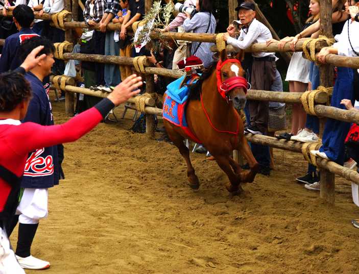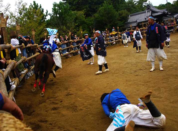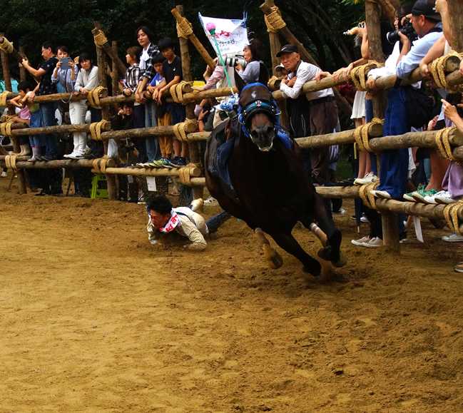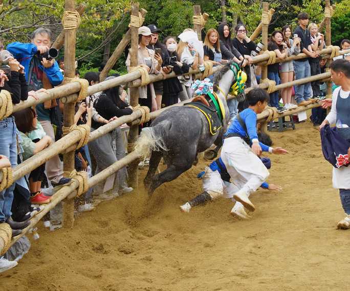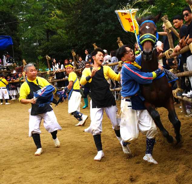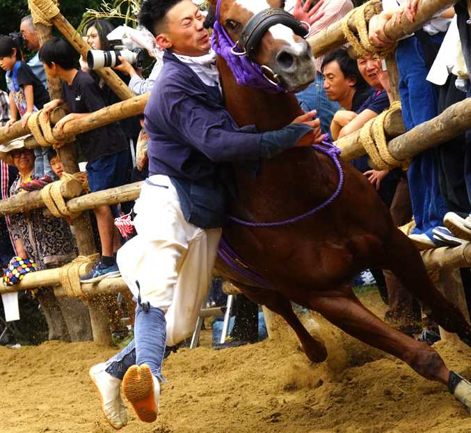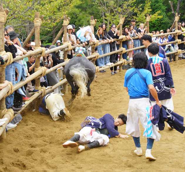 若い馬に飛び乗る 若者が 円陣組んで 声かけ していました