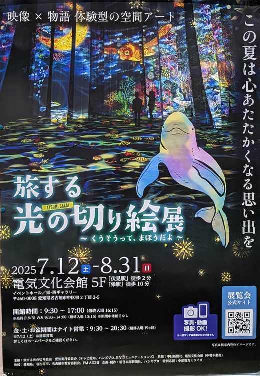 おはようございます蝉の鳴き声 少なくなってきていますもう地上に出てこないのか 暑すぎて季節のずれで なっているのか 判りませんが1週間前くらい コンサートに行きました時 同じ建物で気になる 催し物 出掛けてみました アップいたします電飾での 案内版ポスター的な展示作者 酒井敦美さん の紹介文行灯形式の照明 作品 行灯形式の照明 作品 回っていましたので とてもカラフルでした会場の説明的な 作品海のトンネル かなり大きな作品でした海のトンネル の一部行灯形式の照明 作品自己の影絵を 作品の中に 入り込む天井から 薄い布?が垂らしてあり 光の変化を楽しむ通路の様な場所に 薄地の布 光を当てて順次 変化する 形式円形の投影に 参加者が ポーズを 取るのです丸い投影 大きな鳥の形に 挑戦希望を膨らませて とてもロマンチックトンカツが依頼して 飛び上がって貰いました布が 色々な形で 垂れ下がって居る場所に 投影色も 形も 変化 海辺を基本にしていました軽やかな ニッコリする 光景でした愛知県は味噌文化 桶に石積む 味噌蔵?