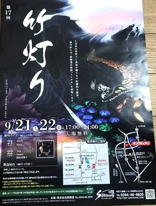 おはようございますいなべ市藤原町のフッッシングサンクチュアリさんが毎年開催されています 竹明かり 出掛けましたアップいたしますポスター会場です ここで釣り堀?が 行われています魚供養で 初日は寺院から僧侶の 読経が行われます会場に16時半に着き 前列の席確保 三脚立てます関係で17時半過ぎに オーナーの挨拶がありました周りが暗くなり ライブが始まりました沖縄 宮古で活躍されている 二人中部空港からの直行便で 到着 宮古に伝わる 民謡を数曲 と一般曲もありました白黒で 撮って見ました トンカツの席から30m位 社長から花束 贈呈です独唱で 2曲ありました続いて 浜田真理子さんの 演奏しながらの 歌でした山間に 響き渡りました池面に写り込み バックの小山の 照明とても 幻想的でした最後に出演者 6人での フイナレー 合唱黒闇の池に浮かぶ 舞台 響き渡る 歌声2時間 堪能しました 花束と 記念写真 光景です竹明かり 光景 当日は風が 強くて 点火しましても蝋燭 直ぐに消えてしまい 毎年2万の点灯ですが寂しかったです前日は風も無く 素晴らしい 竹明かり であったと 説明心に想像しまして 帰路に着きました