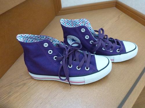 初のコンバースです。もどきは買ったことがあったんですがこの年まで買いそびれてしまいました。うん十年。紫で中に柄があって一目惚れ。さらに2000円ゴールデンウィークはどこにも行楽にはいかないけどちょこちょこ目玉商品があっていいですね。
