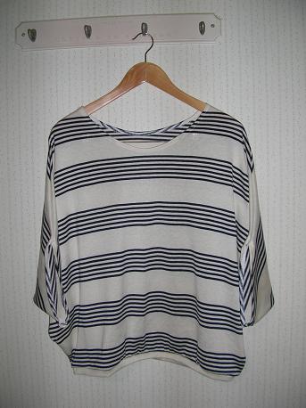 filerさんの型紙でもう一枚ロールアップショートパンツを作りました。今回のウエストはゴムが細いのしかなかったので、2本にしました。もう一枚は娘のドルマンティシャツから型紙をとって作りました。襟ぐりを1度失敗してやり直しました。生成のネップ天竺だったので共布で襟をつけたらビよーんとのびてしまいました。娘のティシャツはテロテロの生地でドレープがきれいにでてるのですが、この天竺ほとんどのびない生地だったのでイメージが全く違うものができました。でも着てみるとなかなかいい感じです。↓の画像ではどんなのって感じですが。作るのは簡単ですが無駄な残り生地がでるのが難点かな。幅もかなりいるし。