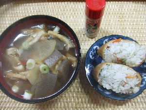 寒い 夜になってかなり冷えてきました。ということで今夜はけんちんそばです。けんちん汁を作り、そばを茹でるので手間が掛かりますが、体が温まります。 五目いなりはスーパの惣菜、主人がそば(そば二杯)だけでは足りないので。少し食べすぎだと思うんですけど、食べる量を減らすことができないみたいです。