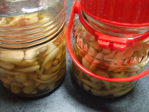 泥ラッキョウを3キロほど頂いたので、塩漬けと味噌漬けにしました。ラッキョウ漬けは下処理がホントにタイヘンで~~薄皮をむき、根元のひげの部分や先端部分を切り、その後洗い、水気をふき取る、これだけで何時間もかかります!!塩漬け1週間ぐらい漬けた後、甘酢に漬けます!! こちらは味噌漬け。梅干こちらは南高梅を購入して漬けました、南高梅はお高いですが出来上がりが違います、美味しいです^^南高梅6キロ、ホワイトリカー200cc、塩(梅の10%、600gぐらい)梅を1時間ぐらい水につけ、ヘタをとり、ざるにあげて水気をふき取る、梅にホワイトリカーをからめ、塩、梅の順に漬けてゆく、最後に塩をふり、残ったホワイトリカーも全体にかける。 いやぁーーーホントに大粒で美味しそうな梅でーーす^^ 梅の倍の重しして、ホコリが入らないよう新聞紙でおおう。 1日たって、水が上がってきました!! 赤シソ漬け赤シソ400g、塩(シソの20% 80gぐらい)シソを洗い、よく水気を取り、2~3回に分けて、塩ふってもみ、絞る、梅酢を加えて梅の上にかける。シソが足りないですねぇ~~もう少し足さないダメですね!! きゃらぶきです^^こちらも頂いたふきで作りました^^ こちらでは 「まだけ」いいます~~一般的には姫たけのこ~というのかな?そちら、こちらと沢山頂いてしまったので(笑)、いろんな料理に使いました。10分ぐらい茹でて、一晩水につけて、アク抜き、毎日水を取り替えて冷蔵庫で保存、1週間ぐらいはもちます。 細切りして、麻婆豆腐&カレーに~~筍の食感がとっても合います^^ 酒と片栗粉をまぶした牛肉と炒めました。酒、醤油、砂糖で調味して、仕上げにかつお節をふる。メチャ、美味しいです~~