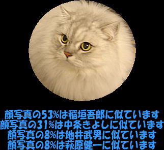 67%小栗旬のポンタです!顔写真の67%は小栗旬に似ています顔写真の15%は梅宮辰夫に似ています顔写真の8%は中村敦夫に似ています顔写真の7%は岡田准一に似ています顔写真の3%は木村拓哉に似ています ところで 小栗旬って誰? 私知りませ~ん3%キムタクってどこらへんかニャー(・_・)......ン?アスティの寝顔でやってみました~結果は じゃ~ん♪顔写真の78%は坂口憲二に似ています顔写真の22%は保坂尚希に似ています=^∇^*= わぁ♪ いいじゃん♪これから アスティは寝顔で勝負だニャー(=^・^=)みなさん もう 365カレンダー 登録しましたか~?昨日は混みこみでしたね3時頃から頑張って 登録できたのが 5時前でした残念ながらアスティは誕生日をゲット出来ず5月5日に登録しました!ポンタは誕生日4月30日に登録できました~すでに 登録済みのお友達猫玉家さん ・ まゆキャットさん ・ やんやんろっくさんフガ男さん ・ 小鉄7さん ・ ミルの母さんももちゃん3009さん仲良しニャンが一緒で 嬉しいヾ(=゜・゜=)ノニャン♪