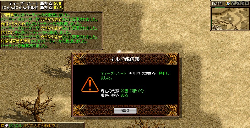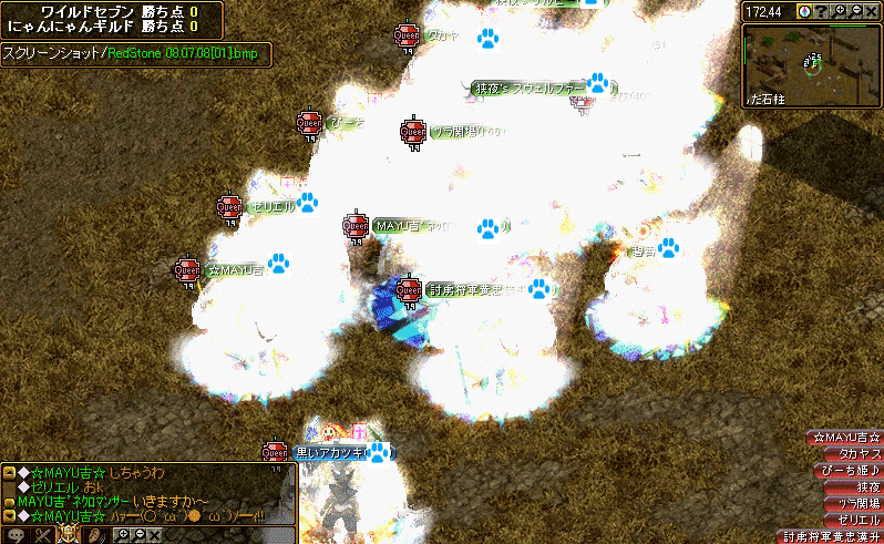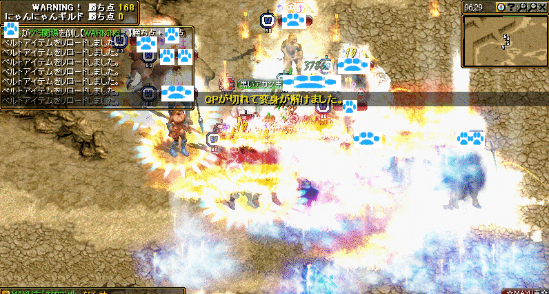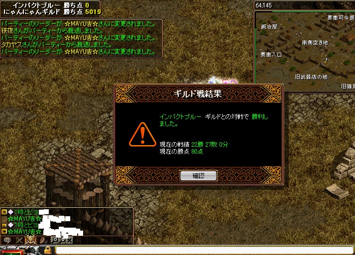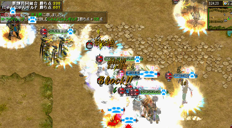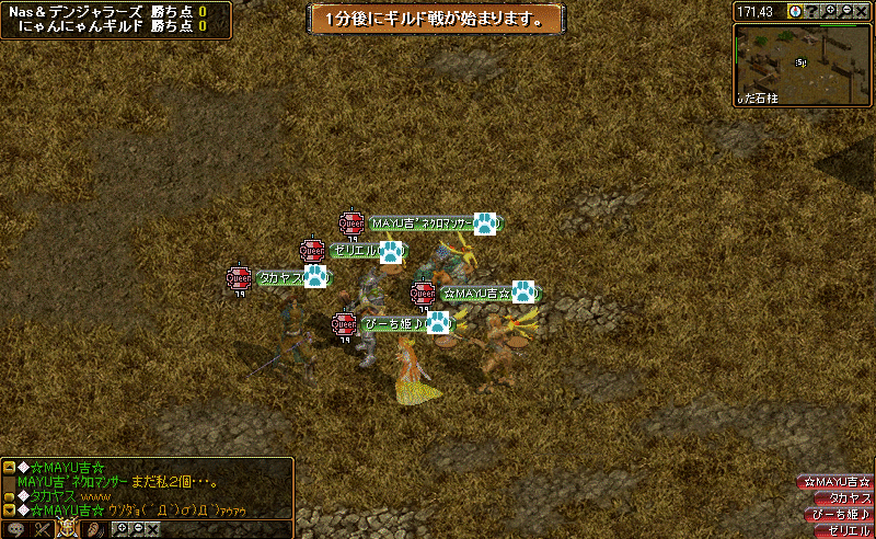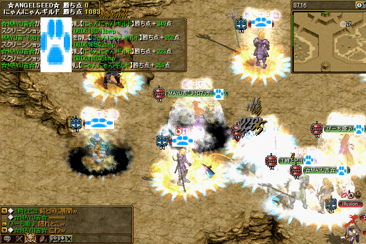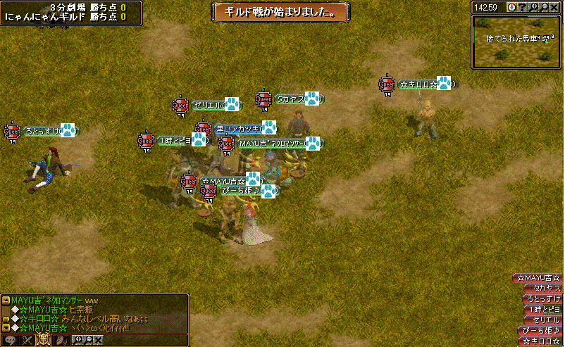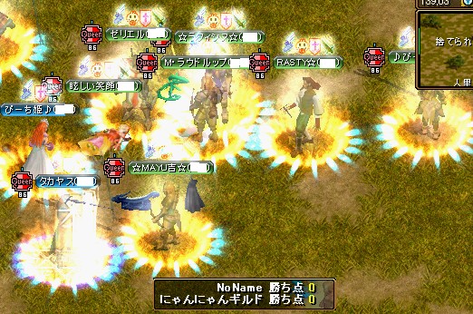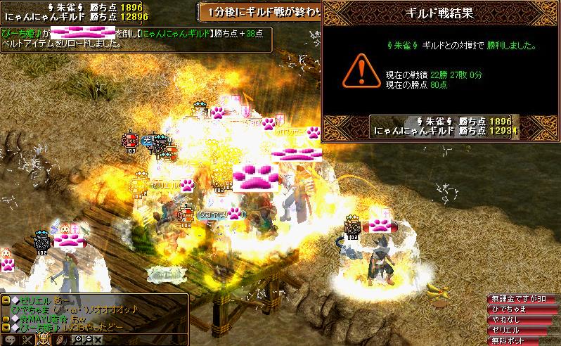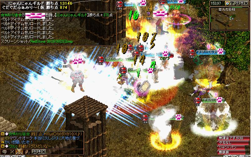 w(´・ω・`)w パッ こんにちわっ!!!マユネクです♪ この前ギルメン達と時森に遊びに行った時のことなんですが!! ランサーのダミーがバグりまくったんですはい!! え?どうでもいいって? そうですかはい! でもSSはっときますから:(;゙゚'ω゚'): はい、ささっと戦績だけのっけときます☆ 2009/09/21 ギルド戦対戦相手【NightCrows】サマ 序盤のSSがほとんどありませんでした(ノдヽ) なんとか序盤はにゃん優先!!しかしお相手さんWIZ陣が上手!WIZ狙おうとしてもなかなか倒せませんでした! お互い平行に点数をとりあってる感じでしたねっ! 武道さんにもすごい困らされました(;^ω^) でもこのままなんとか!! (ノ゚Д゚)八(゚Д゚ )八(゚Д゚ )ノイエーイ WIZさん武道さんがすばらしかった印象でした!!なかなかお互い点がとれませんでしたが白熱しました!! NightCrowsサマ!またお手合わせ宜しくお願いします(o´-ω-)o)ペコッ それではー ぐっばい*^-^*