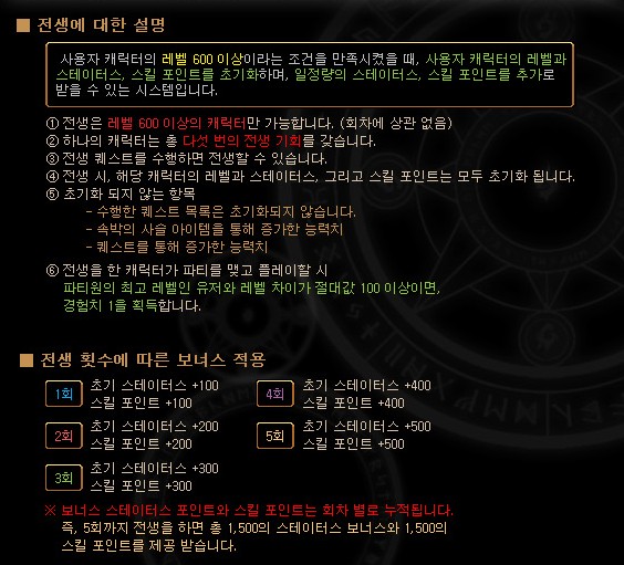 こんにちは.赤い宝石です.下記のように赤い宝石 0.0468 パッチのためのアップデートが進行されます.お客様たちは利用に参考してください.日時2009年 8月 12日 (数) 09:30 ~ 12:30◆追加された事項◆前世システム追加600 レベル異常のキャラクターが肺もダメルの賢者ゲイツを尋ねれば前世クエスト受諾可能.新規プレミアムアイテム追加1.望むことの羽毛2.束縛の鎖3.知識の再分配継ぎ紙4.敏捷の再分配継ぎ紙5.夜明けの封印区※夜明けの封印区を除いたアイテムはにんじん商店でも購入可能.※詳しい内容はアップデート告知事項にイメージなが葱である参照赤い宝石と共に楽しい一株になってください.ありがとうございます. 本家ユーザーからのコメントinfoseek翻訳にてまずみんなアシゲッジだけ育てておいたレプがあるのにあれほど損害が大きいと思って 1から始めるのは謀オリョウンサハングで.しかも 100レブイサング差があるキャラクターとパッしては景色 1しかアン与えるのに誰がハゲッナですパーティーして解体する方法も限界が引き継いでまずレプ 700で前世するキャラクターと 600で前世してするキャラクターと何が変わったのが引き継ぐんですか育てておいたレプを勘案する時率直に理上にアンマッヌンクェストです純然有料化アイテム販売目的を見てマンドンクェストではないか話がナオルばかりします.これは厳然にスピオガブ+レブオルリヌンドングアンソヨドエンシガン+レブビョルでバランス自体を台無しにしておいたんです.600大分たちはどうだろうかモルゲッジだけ育てておいた時間が惜しくても前世と言う(のは)クェスト自体は理上に当たらないクェストで改善事項だと言ったらかえってクェストミッション自体を変更してレブチォギファスキルステッ初期化自体を無くして商用化が濃いユリョファテムをファンブルヘズショッウならゾッゲッネですそして他のミッションで通じるステッをあげてくれる方案をセングガックヘブァヤドエンダと思います.厳然にユーザー達が投資した費用時間を勘案したらレベル初期化自体からが莫大な大きい被害と思います.運営者様考えをしてマンドルオッダギよりはあまりお金だけ着目的に相溶性が濃く見えますねまだ前世を私はアンヘッジだけように楽しくヘワッドンハンユゾとしてあまりアンタカウン言葉がたくさん出て文を書いて見ます 貴重な画像を手に入れましたー!それがーこれだ~ どうも調べたところLv600越えると転生できるみたいです。Lv1からスタートし、そのかわりにスキル・ステポイントが100もらえるみたいですね!2回目転生すると1回目の100ポイント+2回目ということでさらに200ポイント合計300ポイントからのスタートってことですかね! 5回やると・・・Lv1の時点で1500ポイントからということになります(;^ω^) 何年かかるねん・・・(;^ω^) 制限が5回までの模様! 以上です。 そして他の画像をちょいちょい~ <詳細説明>ワールドマップのフィールドを自由に移動が可能だ.消耗性アイテムであり,再使用にディレーがいないというのが長所だ. <詳細説明>自身が連れて通ったミニペッを取って食べてミニペッ属性により自身のステッを増加させることができるアイテム ぇ…(´Д`υ) ということらしいです。(*つω・。)つ))バィバィ