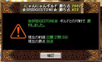 壁|*・ω・)ノ ゚+。:.゚ コンチャァ ゚.:。+゚ MAYU吉デス((。´・ω・)。´_ _))ペコまだまだ寒いですが・・・体に気をつけて冬を乗り切りましょう(`・ω・´)ノ オーッ!! 寒い冬こそ!!温かい部屋でRS!!ヽ(´∀`)9 ビシ!!(社員でゎありませn) そして~にゃんにゃんズGVGVGVGVGV(*゚ロ゚)(*゚ロ゚)(*゚ロ゚) 1/6 VS ☆BRIDGESTONE☆ サマ ☆BRIDGESTONE☆サマありがとうございました((。´・ω・)。´_ _))ペコ ドンドン行きましょう(`・ω・´)ノ !! 1/7 VS 3分劇場 サマ 何度か対戦していただいたけれどいつも惜しくも負けてしまい・・・THEリベンジ(;ω;)ノ!! ようやく叶ったようです(*ノ∪`*)ペチッ3分劇場サマ 何度も対戦ありがとうございました((。´・ω・)。´_ _))ペコ 1/13 YKM連合会 サマ 集中で受けるとかなりの火力のようで失点を許しましたがその分稼げてよかったです!!ε-(*´ω`*) YKM連合会のミナサマ、ありがとうございました((。´・ω・)。´_ _))ペコ 1/14 VS タンキエム サマ カナリ勇気を出しての挑戦デス((;゚Д゚)ガクガク つぎつぎにリザPET発動ですごいことに(・∀・;)それでなくても、かなり厳しかったです。・゚(゚⊃ω⊂゚)゚・。 4000点とれたことで今回ゎヨシとしましょう((*´∀`))b タンキエムのミナサマ、ありがとうございました((。´・ω・)。´_ _))ペコ 1/17 VS 深紅の絶望 サマ 情報によると高Lvさんイッパイいらっしゃるようで・・・少々不安でしたが・・・ なんとか勝利することができましたε-(´ω`;)みなさんめちゃくちゃ硬かったデスね(>ω<;)・・・ 必死に物資投入して稼いだ2000点でした(*ノ∪`*)ペチッ 深紅の絶望のミナサマ、ありがとうございました((。´・ω・)。´_ _))ペコ 1/20 VS 集いし役者達 サマ モウ何度かお相手していただいてるGサマですね(・∀・)♪+.゚時間帯がかなり合うので・・・(*ノ∪`*)ペチッ みんなが平等に稼いで言ってくれたオカゲで結構いい点数が取れましたw(´・ω・`)w 集いし役者達のミナサマ、ありがとうございました((。´・ω・)。´_ _))ペコ 1/21 VS らりぱっぱ旅団 サマ 挑戦です(`・ω・´)ノ オーッ!!最近みんな忙しくて人数が少ないトコロ、カナリ不安ですが・・・ 不安的中!!(・∀・)♪+.゚ また、アホなこといっておりますMAYU吉ゎスルーでおn(ry すごく痛かったですね!!太刀打ちできませんですハィ(・ω・;) らりぱっぱ旅団のミナサマ、ありがとうございました((。´・ω・)。´_ _))ペコ 1/24 VS StrikeAChord サマ だいたいAveが一緒かなとおもって入れてみました!!ヽ(´∀`)9 守りがカナリ不安だったのですが・・・火力で押し勝った感じですねε-(*´ω`*) みんなの奮闘振りをもっとSSに取れてるかと思いつつあまりSSなくてスイマセン(*ノ∪`*)ペチッ 一人痛いシフサンいらっしゃったようで何点か稼がれましたが火力でその分稼げてよかったです(>ω<;)・・・ 守りもギリギリラインだったとおもいますが、なんとかやっていけてよかった!! StrikeAChordのミナサマ、ありがとうございました((。´・ω・)。´_ _))ペコ にゃんにゃんズも何人か冬眠してる方がいますが・・・一緒に楽しくGv・Gハン・Gチャしてくれる方・・・大募集!!。*゚+ 職・Lv・・・っていうかなにも問いません!!一緒に楽しくRSしたいという気持ちだけで十分デス(・∀・)♪+.゚ いつでも、MAYU吉や・・・この紋章をつけている・・・おじちゃんおばちゃんお兄さんお姉さんに気軽に声かけて下さいマセ((。´・ω・)。´_ _))ペコ