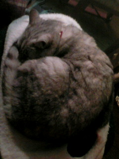 ちょっとこの映像は暗いんですが。回転椅子で眠るしましま1号です。