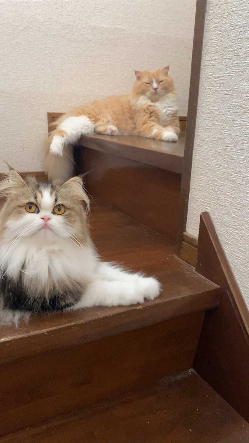 仲良く階段の上で、だら〜っとくつろぎ始めたとよ。