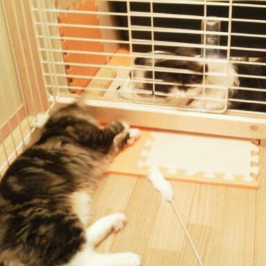 はーちゃんの変顔発見。歯が出ちゃっています。たいくつだけど、噛むと怒られるし、だけどねこうさぎは見ているし、柵に口を押し当てて「ぅぅぅー。」って思っているんだよきっと。しょうがないなぁ。ボクが遊んであげるよ。ぐ「はーちゃん、遊びに来たぉ!」は「ぐーちゃん、暇暇だよー。」ぐ「じゃぁさ、じゃぁさ、手、出して!」は「こ、こう?こんな感じ?」ぐ「まだまだー!もっと出して!」は「・・・・・。なんか嫌な予感がするな。」ぐ「そうそう!キック キック キック!!!」は「うわーん、噛まないでー!痛いよー。」ぐ「楽しいね、はーちゃん!」は「う、うん・・・・・。」キック キック キック!キック キック キック!!キック キック キック!!!ぽちっと応援してね!
