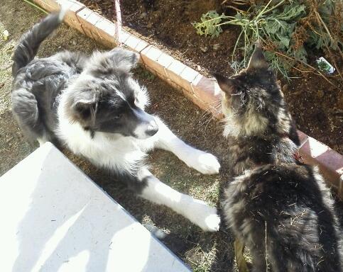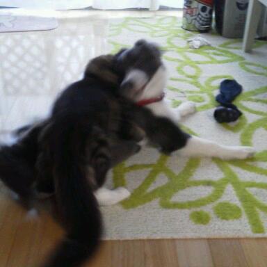 最近ボクは、よくはーちゃんのお家へ遊びに行きます。はーちゃんのおトイレの上に座らなければ、ねこうさぎもはーちゃん家へ行くことを許してくれます。はーちゃんのお家は、シーツとぷぷぷんのトレーナーでふかふか。柔らかくていい気持ち。ぐ「はーちゃん!遊びに来たぉ!」は「また来たのー?」ぐ「うん!淋しいんじゃないかと思って!」は「あ、ありがとぅ・・・・・。」ぐ「どういたしまして!」は「でも、おとなしくしてくれる?」ぐ「そんな!ボクがおとなしくないような言い方して~。」は「・・・・・・・・・・。」ぐ「むっ!!!尻尾!はーちゃんの尻尾!わーい、わーーーい!!!」(ぺしぺし)は「やーめーてーよー。尻尾で遊ばないでー。」ぐ「はーちゃん大好き!!!」(抱きつきっ)は「頭に抱きつくなー。やーめーてー。爪が頭に食い込むー。」ね「ずいぶんと仲がいいね。楽しい?」ぐ「うん!超楽しいっ!!!」は「・・・・・。たっ、多分楽しい・・・。」みんなが楽しいってイイヨネー。はーちゃんも嬉しそうだよ。今日はね、近所のホームセンターへ社会科見学に行ったんだよ。そこは「ペット可」なお店なんだって。はーちゃんはこの前車でビビリウンチとリバースしちゃったから、今日はお留守番。。。そこにはペット専用のカートが有るんだよ。ボクはそれに乗せてもらったよ。ぐ「うーむ。これが”ほうむせんたあ”というのかっ!」”ほうむせんたあ”はすごく広くて、すごく明るくて、色んなモノがたくさんあって、小さなワンちゃんやニャンちゃんがいっぱいいたよ。今日は特別にワンちゃんニャンちゃんが多いんだって。ねこうさぎがペット売り場の人と話しているよ。ペ「あら、メイちゃん。おとなしい~。」ぐ『メイちゃんじゃないもん!ぐーちゃんだもん!』ね「眠いのかしらね?」ぺ「いえいえ、ネコさん連れてくるお客様よく居ますけど、どの子もフー!って大暴れですよ。今日は特別犬猫多くて大騒ぎなのに、落ち着いていてすごいですねー。」ね「ワンちゃん(ハーデス)と一緒に育っているからでしょうかね。」ぺ「あぁなるほど~。ワンちゃんの犬種は?」ね「ボーダーコリーです。」ぺ「きっと優しい子なんでしょうね~。」そうだよ!はーちゃんは超優しいよ!大好きだよ!店員さんはベタ褒めしてくれたよ。そんなに驚かない事がすごかったのかな?色んな人間に会えて楽しい日だったよ。今度ははーちゃんと行きたいな、社会科見学!帰ってきたら眠くなっちゃった。ぷぷぷんの椅子の上でぐーぐー。やっぱりお家が一番落ち着くにゃ!おやすみなさい~。ぽちっと応援してね!