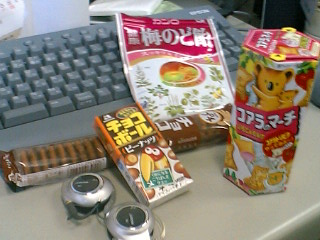 昨日の夜、フラリと立ち寄ったカマーのページ。そこで見事にカマーの2900Hits目を踏んでました(*゚ロ゚)ハッ!! さっそくカマーの掲示板に書き込みをしてその日は就寝。。。 そして今日☆←カマー風(ごめん、今回だけパクらせてw) 15時くらいに憧れのカマーからお電話をいただきました☆「今研究室おる~?今からそっち行っていい?」とのことでした☆「ええで~。待ってマース☆」 そして1分後、カマーが昨日のキリ番のプレゼントを持って研究室へ来てくれました☆ カマーからの贈り物(のど飴はさすらい・・太郎さん。がくれたのど飴です☆) コアラのマーチにクエクエチョコボール、プチシリーズのチョコビスケ。さらに土曜日に買ったばかりだというのにサイズが合わないから、とカッケーイヤホン(Victor)までくれました☆ カマー!!サービスしすぎだよ(*゚ロ゚)ウワーッ!! すんげえ嬉しかったです。ホントにありがとう(o^∇^o)ノ お菓子は研究の合間のお腹空いたときにイタダキマス☆ イヤホンは大切に使うよ。サイズピッタリだったよ☆ カマーという漢の器のデカさを改めて知りました☆ 次の日記の更新、楽しみにしてます☆ ありがとう、カマー