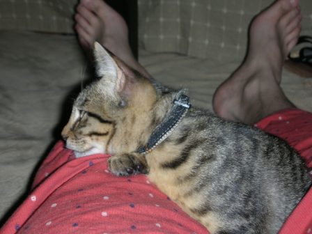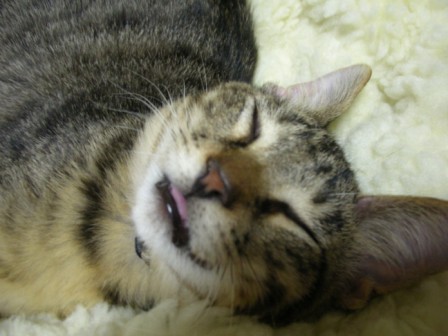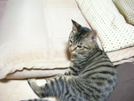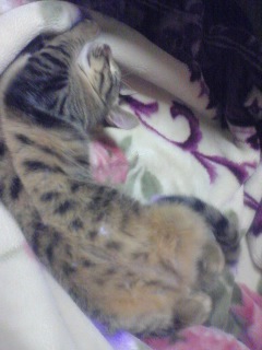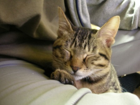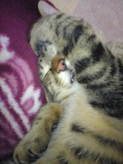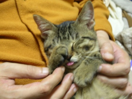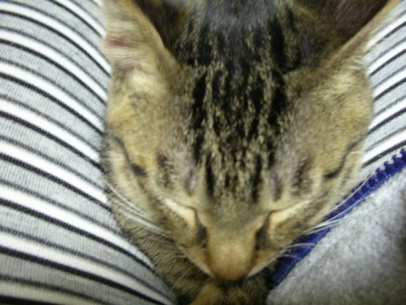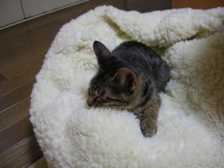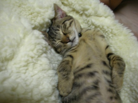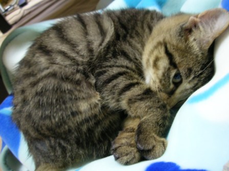 ごえもんは、よく寝る。ごえもんは、というよりは、子猫は、か。寝顔を見てるだけで、こっちも穏やかな気持ちになる。ノビして、そのまんま、また寝てしまった。どこのニャンコもそうなのか、変なカッコで寝るんだよなー。夕方、あまりたくさん寝かせてしまうと、夜寝ようって時間からエンジンが掛かってしまうので、起こしてみたら、「なにすんだよー!」「やるかぁ?」「やだっていってるでしょー!!」ごめんごめん、ごえもん。でも、ちょっと楽しいw