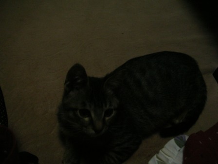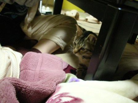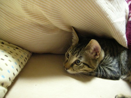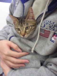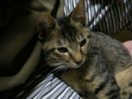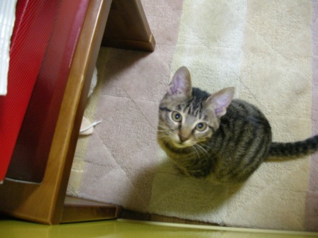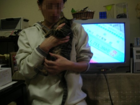 今日は、ごえもんの保護主さん(mandarin orangeさん)と彼氏さんに我が家に遊びに来ていただいた。mandarin orangeさん、彼氏さん、今日は遠いところ、ご足労いただいてありがとうございました。特にmandarin orangeさんは、体調が思わしくないところ無理して来ていただいて、本当にありがとうございました。mandarin orangeさんには、デジカメの設定まで教えてもらってしまった。風邪も治って、成長した姿を見ていただこうと来ていただいたのに、ごえもんビビリまくりだった。。orzこの体たらく。。いやいや~っこわいよこわいよ~っ!!相方が抱いていても逃げようとモガモガ。先日相方の友達や親御さんがやってきた時に比べたら全然落ち着いた感じだったが、あんなに可愛がってもらったのに、臆病モード炸裂。。。mandarin orangeさんに助けてもらわなかったら今のお前はないんだぞ、ごえもん!育ての親としては、ちょっと情けなかった。。しばらくはテレビの下などにひたすら隠れていたがちょっと落ち着いてきたら必殺ネコじゃらしに誘われて出てきて遊ぶようになった。もっと普段の暴れん坊将軍ぶりをmandarin orangeさんにお見せしたかったのに、残念。。デジカメの設定も教えていただいたことだしまたイイ写真をたくさん撮って載せられるようにがんばろう。