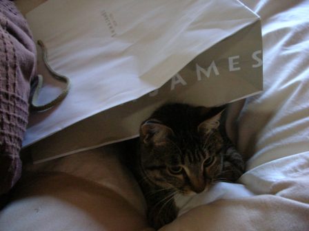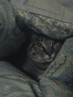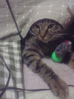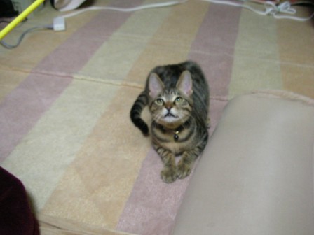 今日は、相方がお休みだったので、嬉しかったのか、ごえもん遊んでモード全開だったらしい。目がやんちゃだwやる気マンマンなところがいいね。ガジガジってしておいて、ニャッシャーッ!カーッ!夜、Wii Sportsをやりに相方の友達が来たのだが、やはり隠れてしまった。が、今日きた人には、いつもよりは警戒心が薄く、しばらくしたら出てきて、猫じゃらしで遊んでもらっていた。なんだろう、やはり間を空けずに人がくれば大丈夫なのかな。一人だったからなのか、酒好きの人だったからなのか。んー、わからん。。