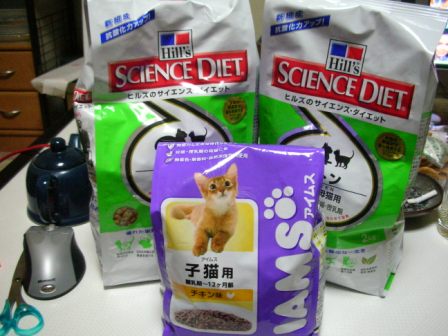 今日、注文しておいた仔猫用フードが届いた。今はカリカリはヒルズだが、食べ飽きないようにとのパパの配慮によりアイムスも混ぜてお買い上げ。パパったら、ごえもんには滅法あまい。ママにもそのくらいあまくしてくれよ。アイムスのパッケージの仔猫、けっこうかわいいなぁ。ま、うちのごえもんにはぜんぜん敵わないけどねっ by パパま、たしかに(^^;)こんな顔で見上げられたらねぇ・・・最近では、パパのまたぐらにもすっぽり収まるようになった。ママのおなかの上で、ふみふみ。はぁ~、ママもメロメロです(^^;)さて、明日の朝は何時まで寝てくれるのかな・・・