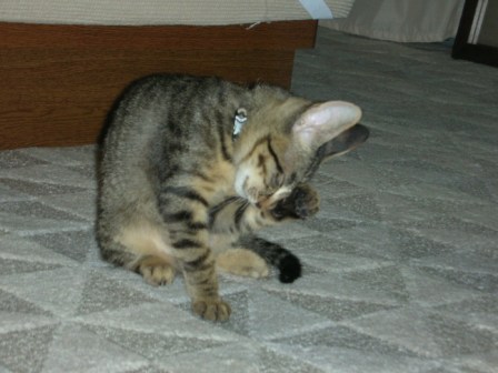 ごえもんに一目惚れした理由のひとつは、でこちんの立派な「M」やっぱ、Mが入ってるニャンコはイイ。おっちゃんだけかなw指でなぞってみたりするんだけど、ごえもんにはイヤな顔されたりする。最近のごえもん、早朝深夜のひとり遊びがどんどん激しくなってきた。これまでは、走り回るくらいだったのだが、それに上下運動が加わってきた。元気になったのは嬉しいけど、早朝深夜にやるのは問題だ。。これって、しつけの問題なのだろうか。