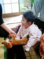 世の中がGWまっただ中なので「それは乳児~」もお休み気分でまったり進行です。激しいオチは少なめとなっております。あらかじめご了承ください。今日は土曜日、母上の育児休暇日です。そんなわけで今日一日は父上をかまってあげました。朝ご飯(7倍粥)をさらっと平らげた後父上とお散歩に出かけました。朝早いこともあり人通りも少なかったので父上は鼻歌交じりに歩き始めました。歩いているとこちらに向かって声をかけてくる動物がいました。犬殿です。おつとめご苦労様です。次に遭遇したのがタケノコ。大きいです(ちょっすん比 1.3倍)。あまりの大きさだったので母上に写真を見せたところ「大きすぎてあまりおいしくないかもね。」と申しておりました。母上の基準はやはり「食」のようです。家へ着く頃には父上の足腰はギシギシと悲鳴を上げていました。母上の腰はガラスの腰ですが父上の腰は古民家の床のようでした。父上の腰が落ち着いたところでギターのレッスンをしました。セレブなちょっすんにはやや上品さに欠けるかなと思いましたが父上があまりに熱心なのでつきあうことにしています。レッスンが終わったところで最寄りのおもちゃ屋さんへアルバムのジャケット撮影に行きました。ロケンローラーちょっすん。しかしこのサングラス、結局買ってもらえず・・・。ちょすん・・・。 ←サングラス・・・ほしかった・・・。