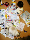 本日も酷い嵐でした。父上は朝からお仕事で東京へ行ってしまい不在だったため母上と二人心細く過ごしましたよ。外はバケツをひっくり返したような騒ぎだったので出かけるわけにも行かず、悶々と室内で過ごしましたがさすがにストレスが溜まってしまい。発狂寸前のちょっすんを見かねた母上が、生協のチラシを下さいました。鮮やかさといい、質感といい、素晴らしいですねぇ。散らかしても散らかしても紙はまだありますし。ふわぁ~、すっきり!!と思いきや。深夜に帰ってきた父上に昼食を自慢されてしまいました・・・。父上ずるい!!!! ←皆さんも一緒に抗議のクリック!