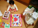 本日は、ちょっすん生誕1周年祝賀パーティが開かれました。誕生日は明日なので今日のパーティは前夜祭といったところでしょうか。父上方のお祖父様をお招きして盛大に催しましたよ。もうちょっすんは1歳になるんですよねぇ。自分でいうのも何ですが、1年間よくぞ頑張ってきたと思います。大人の皆さんは育児の苦労を語りたがりますが、皆さんが知らないだけで乳児だって色々と苦労があるのですよ。思考と体の動きが結びつかないことがどんなに不便であることか。言葉で意思を伝えられないことが如何にもどかしいことか。ちょっすんは思うように動かなかった四肢を日々の努力によってヒップウォーキングができるまでに高めました。猛獣共の魔の手から自分を守り通しました。本当に偉いちょっすんです。そんなちょっすんにご褒美の山!待ちに待ったお誕生日プレゼントです。父上方のお祖父様、母上方のお祖父様お祖母様曾お祖母様、そして父上母上から。所狭しと並べられてどれから開けたらよいのか迷ってしまうほどでした。詳しいレポートはまた後日お送りいたしますね。パーティでは色々なイベントもありました。一生食べ物に困らないように、と一升餅というのを背負わされたりしましたよ。一升というのは実に重いものなのですねぇ。ちょっすんの体重の5分の1ほどなのですもの。体重60kgの大人で換算すれば米1袋以上ですからね。頑張ってヒップウォーキングを披露したかったのですが箸より重いものを持ったことがないセレブ乳児ですからね、ひっくり返ってしまいましたよ。"一生"の重みは乳児に背負わせるにはまだ重すぎると思います。父上母上にもうしばらく背負っていただきたい所存でございます。鯛の塩釜焼をお祖父様と一緒に割ったりもいたしました。 豪華な料理もいただきましたよー。お食い初めや初節句の時のようにご馳走を目の前に指をくわえているだけの乳児ではちょっすんはもはやありません。母上の作った筑前煮やお吸い物、先ほどの鯛もしっかりといただきましたよ。食後は念願のケーキ!父上と母上がお気に入りのシェ・イリエで特注してくださいました。もう紙っぺらのケーキを前に涎を飲み込んでいるだけの乳児ではちょっすんはないのです。初めてのケーキのお味は・・・うーん、カ・イ・カ・ン! ←皆様の愛のクリックもカ・イ・カ・ン!