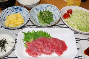 まぐろ切り落としとろろきゅうりと大葉酢の物キャベツパイナップル風呂上りのおやつ バナナ午後雨強かったなもう眠い