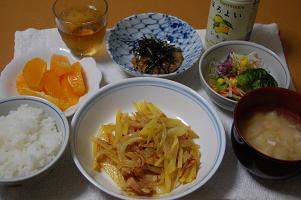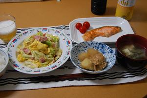 今日の夕ご飯ベーコンキャベツ炒め大根と油揚げ煮鮭冷蔵庫の余り物な夕飯風強かった