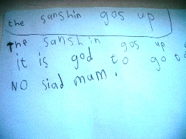 家に帰ると切手の貼ってない手紙があり開けてみると娘の書いたポエムが・・・・The sunshine gose upThe sunshine gose up at the world.It is good to go to the park.No! said mum.ところどころスペルの間違えはありますが2月にここの小学校に入学して9ヶ月こんなことも書けるようになったんだ・・・・。
