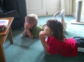 帰国を前にこの一年を振り返り考えることはやはり第二言語を習得するには環境が与える影響は大きいと言うことだ。一番娘の英語力をアップさせたものは友達。子供は子供から影響を受ける⇒遊ぶのに一生懸命だからすぐ覚えるここでは学校が終わるのがどの学年でも3時だからその後は友達の家に行ったり友達が家に来たり・・・現地の子供との交流が多い。その次が学校だちゃんとした読み書きをしっかり教わった。生活の決りもね。あとは学校外での生活何処に行っても英語だから英語が自然と耳に入って来る。ここまでが環境で・・・・その次が親の言語と努力我家の場合この一年は父親30%(英語) 母親10%(日本語)でやって来た。特に父親の方は自国でもあるので本領発揮ってとこでした。あとの10%はなんだろな~????仲良くビデオを見る娘と友達