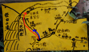 赤い線が頂上までの道のり。青い線はギブした地点。