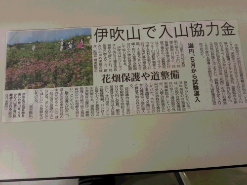 今日の朝刊に今年の5月より滋賀県の最高峰でもある伊吹山で試験的に1人300円の入山協力金を導入するという記事が掲載されていました!富士山でも今夏より入山協力金の導入開始されますし、日本百名山で入山協力金を導入する山が増えて来ました!登山者が増えると登山道の整備やトイレの設置、補修、植生の保護等に費用がかかります。今までは国や地方が補助したり、ボランティアや地域の人達の協力で維持されて来ましたが限界があると思います。入山協力金で一部でもそれらの補助に使われることは尾びやんは賛成です。