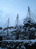 昨日の厳しい天候から一転、今日はとりあえず雪は一休みで晴れ上がりましたその代わりと言ってはナンデすが・・・今朝の最低気温は-5℃でした北海道に暮らす方々に比べると「何よ、そのくらいどうってことないジャン」っていわれそうだけれど、私たちの街では極マレなんですもう早朝起きたら、寒くて身体中凍傷になりそうな気分でした 所謂『放射冷却』って現象なんでしょうねその分、これだけくっきりと空気が澄んでクリアな張り詰めた青空が広がったって事なんですね。綺麗な月もまだまだオンエアでした 昨日の今日で、あっちも冷え込んでいるかなぁとマタマタ息子を想いつつ・・・山ほどの洗濯物(息子の置き土産)を片付けながら家事に忙しく動き回りました 故郷の景色偲んで暖をとる 屋根からは大きな氷柱が下がっています。テレビのサスペンスドラマで、凶器に使われそうな物騒な氷柱ですが、これもここ数日の冷え込みの厳しさを証明してくれているんですねもうベランダも見ての通りのアイスデコです でもこの晴れも今日限り・・・明日からはまたです まだまだ厳しい冬は続きます see you again