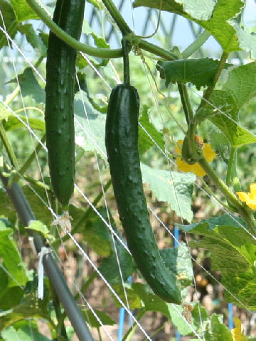 暑いデスね相変わらずの空梅雨状態ですね予想気温は27℃といっているけれど、窓に貼り付けてある温度計は、30℃を超えてますよ 春先に植えた胡瓜の苗がイイ具合に育って、毎日実をつけてくれます。昨年までは地這えだったのですが、今年から支柱を立てて栽培する方法に変えました。その方が実ができても解りやすくて虫に齧られないので・・・。 水をやったり液肥をやって育っていくのを楽しみにしていました。そしていよいよでき始めましたよ、小さな棘がたくさん出た胡瓜が・・・。 毎日、朝と夜の2回、シッカリ収穫しています胡瓜は適度な大きさになったらサッサと収穫しないと、直ぐに大きくなってしまいます。うっかり「明日にしよう」とか言ってのんびりしてると、あっという間に棍棒みたいになってしまうのですそうなってしまうと、胡瓜の味も大雑把で美味しくないし苗も弱ってしまうとか・・・。 朝はサラダ、夜は酢の物と用途は充分ですお陰でスーパーで胡瓜を買わずとも毎回捥ぎたてを食べてますささやかなことですが、「幸せだなぁ」ってふと感じる時ですね 胡瓜は90パーセントが水分で、あとは微量ながらビタミンC、カロチン、カリウムが含まれているそうです 若い頃、胡瓜パックというのをよくやりました、薄くスライスして顔面に貼り付け小一時間ジッとしていると・・・胡瓜はカパカパに乾ききってしまいますが、顔はツルツルになりました。これは胡瓜に含まれているビタミンCのお陰のようです。懐かしいなあ・・・でも、ちょっとモッタイナイつかいみちだったかも 自家製の野菜を愛でて生きている 命あるもの天に抱かれ生きている see you again