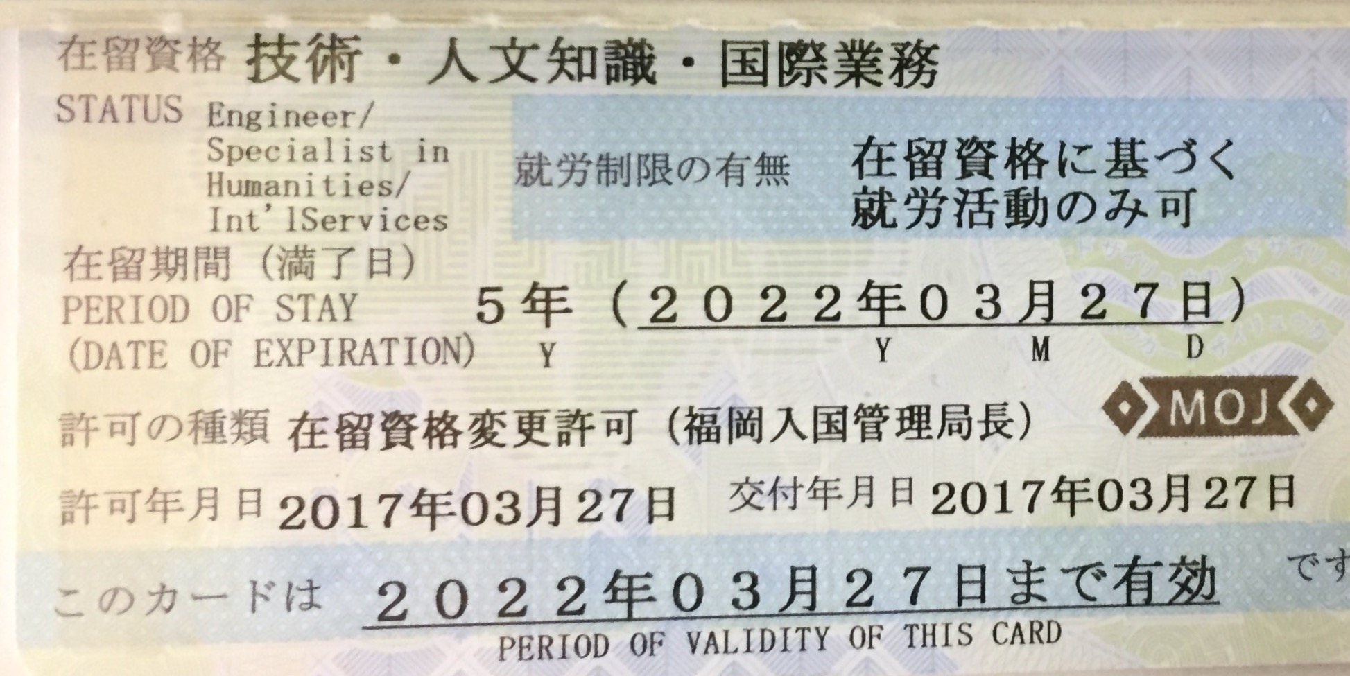 在留資格変更許可在留資格 技術・人文知識・国際業務在留期間 5年頂きましたウレシイ