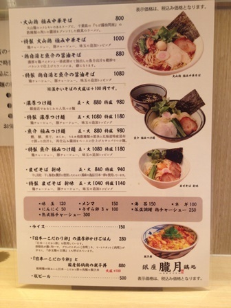 出張で立川に宿泊していたので、晩ご飯で駅ナカの立川グランデュオ7階にある「朧月」に行ってきました。つけ麺の美味しい名店で食べるのも楽しみでしたが、個人的には店に着くまでのエスカーレーターが1階から4階まで直通は圧巻でした。(予想外の驚き)レストラン街に着いて、一周歩いてみて、「朧月」に入店、夜の時間帯だったので空いていました。すぐに濃厚つけ麺 大 880円を注文。店内に麺の茹で時間は約8分との注意書きがありました。お店が空いていたこともあり、ほとんど注意書き通りの時間で出てきました。麺は中太ストレートで強目のコシがあり、ちょうどいい感じでした。小さめの豚、鶏チャーシューが2枚ずつ、ウズラの煮卵、チンゲン菜?、三つ葉、のり、ナルトがトッピングされていましたが、個人的には、三つ葉が必要無かったです。(においが苦手です)食べログのレビューにもありましたが、今だとこういう感じのつけ麺はよくあるタイプの濃厚つけ麺だと思います。麺にスープが絡み過ぎて、最後に割りスープが頼めないくらい、使い切ってしまいました。(残念‥)中華そば、まぜそばもあるみたいなので、また立川に来ることがあれば行きたいと思います。基本的に自分はつけ麺をほとんど食べたことが無くて、評価はしにくいですが、パンチのあるつけ麺が好きならいい店だと思います。