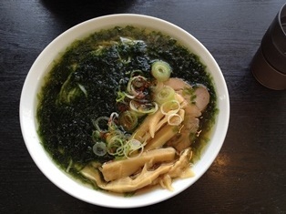 ランチで、上の娘と2人で中華そば 上々へ行ってきました。13時過ぎでしたが、2人だけの待ちでナイスタイミングでした。約10分弱待って、テーブル席に案内されました。自分が注文したのは、限定麺の「生青海苔中華そば」750円です。(娘はノーマルの中華そば醤油)あっさりしていましたが、磯の香りがして美味しかったです。テーブルの上に自分で入れることができる青ねぎが置いてありましたが、今回は青海苔たっぶりだったので入れませんでした。毎回、書いてる気もしますが、ここのラーメンは基本的にあっさりしているので、是非、濃厚な限定ラーメン(以前に限定でやった竹岡式みたいなタイプ)を出して欲しいです。↑生青海苔中華そば 750円 チャーシュー、メンマも美味しいです。